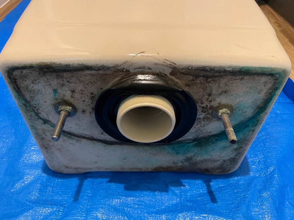 密結パッキンが劣化し変形している事により漏水している状況でした。この場合パッキンだけ交換する事はナンセンスです。ついでに密結ボルトも交換した方が絶対に良いです。部品代も1,000円しません。