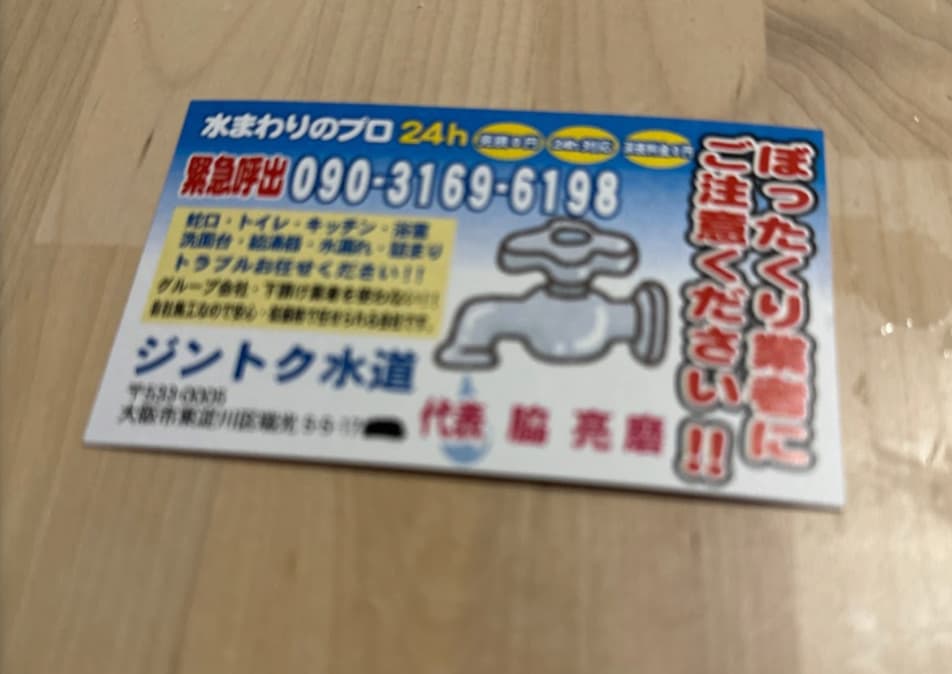 お風呂蛇口水漏れでお世話になりました。 品番シールが剥がれ、取説もなくなり 修理部品がわからず、それでもなんとか部品交換で治るならと伝えると、必死にカタログと照らし合わせ探して下さっている姿に感動しました。前の2社は交換の一点張り。 そんな中、東淀川区で地域密着のジントク水道さんを見つけお願いしてみました! この部品かもと試して頂きましたが合わず、、ただそこまでお客様目線でしてくださり信頼、信用があるお兄さんだったので こちらから本体交換のお願いをしました。 本体交換の値段も2社より安く 大満足の出会いでした。 早速勝手に友達に広めさせて頂いてます!笑 ありがとうございました😊